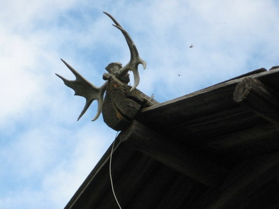 Встречается и другой характерный элемент. Дело в том, что на Мезени было распространено оленеводство, поэтому здесь нередко можно увидеть охлупни, украшенные настоящими рогами оленя. По всей вероятности, в таком декоре можноусмотреть следы почитания оленя, культ которого, может быть, в меньшей степени, чем коня, был свойственен отдельным русским районам. На одном из домов в селе охлупень украшен фигурой, напоминающей утку.