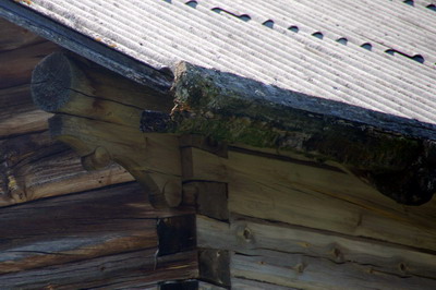 По всей видимости, в начале прошлого века украшались резьбой выпуски бревен под кровлей, теперь же они остаются без элементов декора.