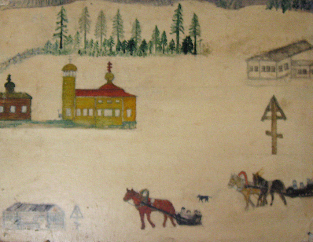 На картине мужа Пелагеи Яковлевны Дьячковой на месте клуба стоят две церкви
